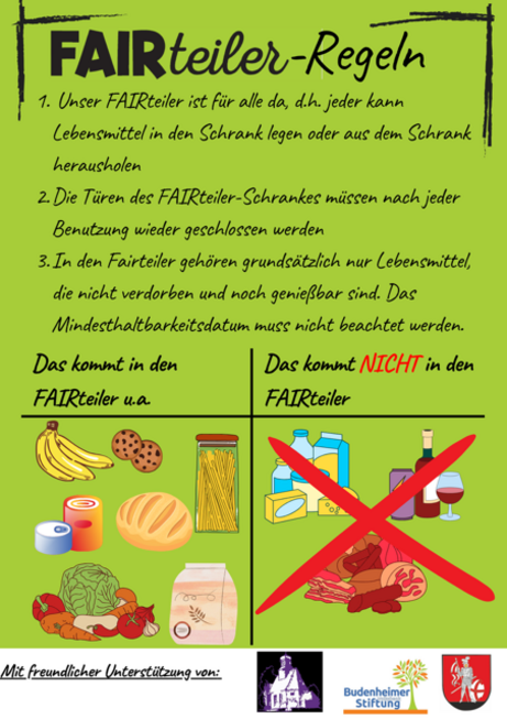 Der Schrank wird drei- bis viermal wöchentlich von ehrenamtlichen Helferinnen und Helfern befüllt. Die Lebensmittel im FAIRteiler sind größtenteils überzählige Produkte, die sonst in der Tonne gelandet wären. Sie stammen vom Cartitas-Zentrum Laurentius in Ingelheim und von Budenheimer Lebensmittel Händlern. Auch private Haushalte können überschüssige noch gut essbare Nahrungsmittel in den FAIRteiler legen.
